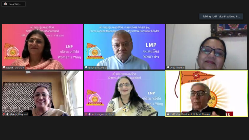 શ્રી લોહાણા મહાપરિષદ મહિલા સમિતિ, મુંબઈ સહ મહારાષ્ટ્ર અને શ્રી લોહાણા મહાપરિષદ આધ્યાત્મિક કેન્દ્ર ના સંયુક્ત ઉપક્રમે આયોજિત ઓનલાઇન ઝુમ નૃત્ય ભક્તિ કાર્યક્રમ બુધવાર તા- ૨૯/૯/૨૦૨૧ ના રોજ બપોરે ૪-૦૦ કલાકે સફળતા પૂર્વક સંપન્ન થયો. કાર્યક્રમની શરૂઆત ગણપતિ વંદના તથા રઘુવંશી ગાથા ના એક અનેરા નૃત્ય દ્વારા રજુ કરવામાં આવી હતી. પશ્ચિમ મહારાષ્ટ્ર અધ્યક્ષ શ્રીમતી ક્રિતીબેન નાગ્રેચા એ માતૃસંસ્થા શ્રી લોહાણા મહાપરિષદ મહિલા પાંખ ના અધ્યક્ષ શ્રીમતી રશ્મિબેન વિઠલાણી, મુંબઈ સહ મહારાષ્ટ્ર મહિલા સમિતિ ના અધ્યક્ષ શ્રીમતી જ્યોતિબેન ઠક્કર, મહાપરિષદ આધ્યાત્મિક કેન્દ્ર ના અધ્યક્ષ શ્રીમાન ગિરિશભાઈ ડ્રેસવાલા, મહારાષ્ટ્ર મહિલા સમિતિ ના સેક્રેટરી શ્રીમતી મીનાબેન મગદાણી, કાર્યક્રમને રંગારંગ કરનાર વિવિધ વિભાગો ના અધ્યક્ષ, ભાગ લેનાર તમામ કલાકારો, વિવિધ સ્થળોએ થી ઉપસ્થિત રહેલા મહાનુભાવો તથા તથા ઝુમ પર ઉપસ્થિત સર્વે મહેમાનો નું હાર્દિક સ્વાગત કર્યું હતુ.