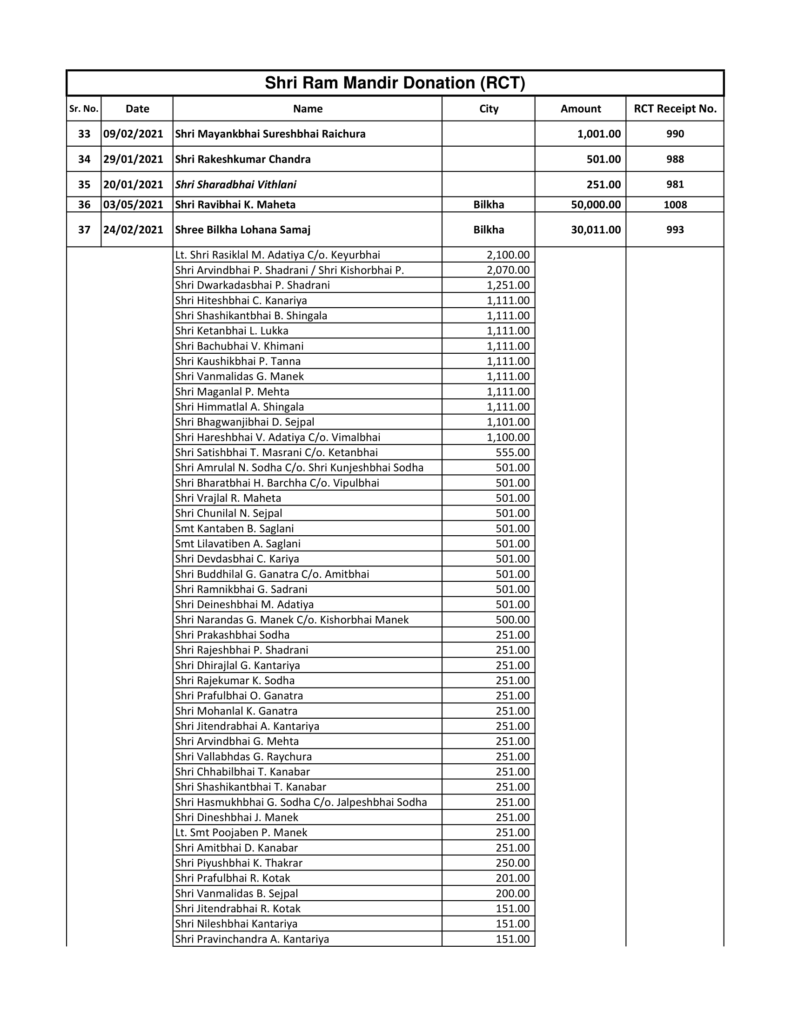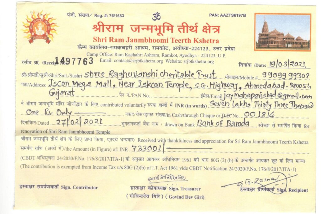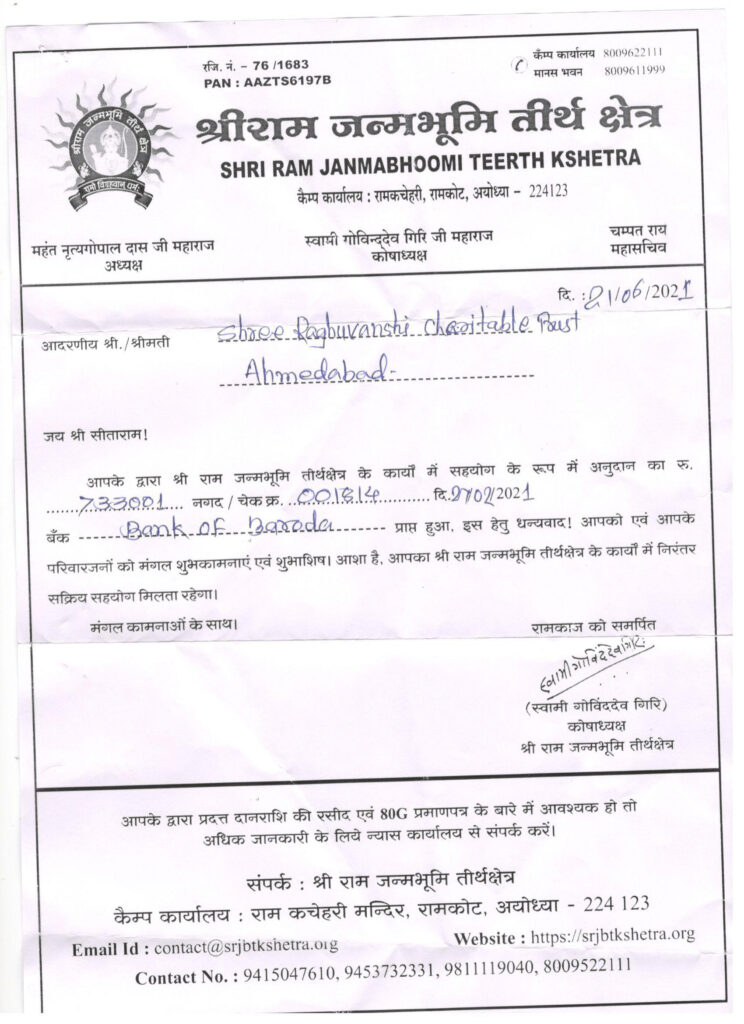 અયોધ્યામાં તૈયાર થઈ રહેલા આપણા આરાધ્ય દેવ, મર્યાદા પુરૂષોત્તમ ભગવાન શ્રીરામ ના ભવ્ય, ઐતિહાસીક મંદિર માટે રઘુવંશી સમાજના આગેવાનોના સાથ સહકાર થી માતૃસંસ્થા શ્રી લોહાણા મહાપરિષદ દ્વારા કુલ ₹ ૭,૩૩,૦૦૧/- ની રકમ રઘુવંશી ચેરીટેબલ ટ્રસ્ટના નામથી શ્રી રામ જન્મ ભૂમિ તીર્થ ક્ષેત્ર નામે (તારીખ ૨૭ ફેબ્રુઆરી, ૨૦૨૧ – બેન્ક ઓફ બરોડા, ચેક નંબર ૦૦૧૮૧૪) મોકલાવી આપેલ.